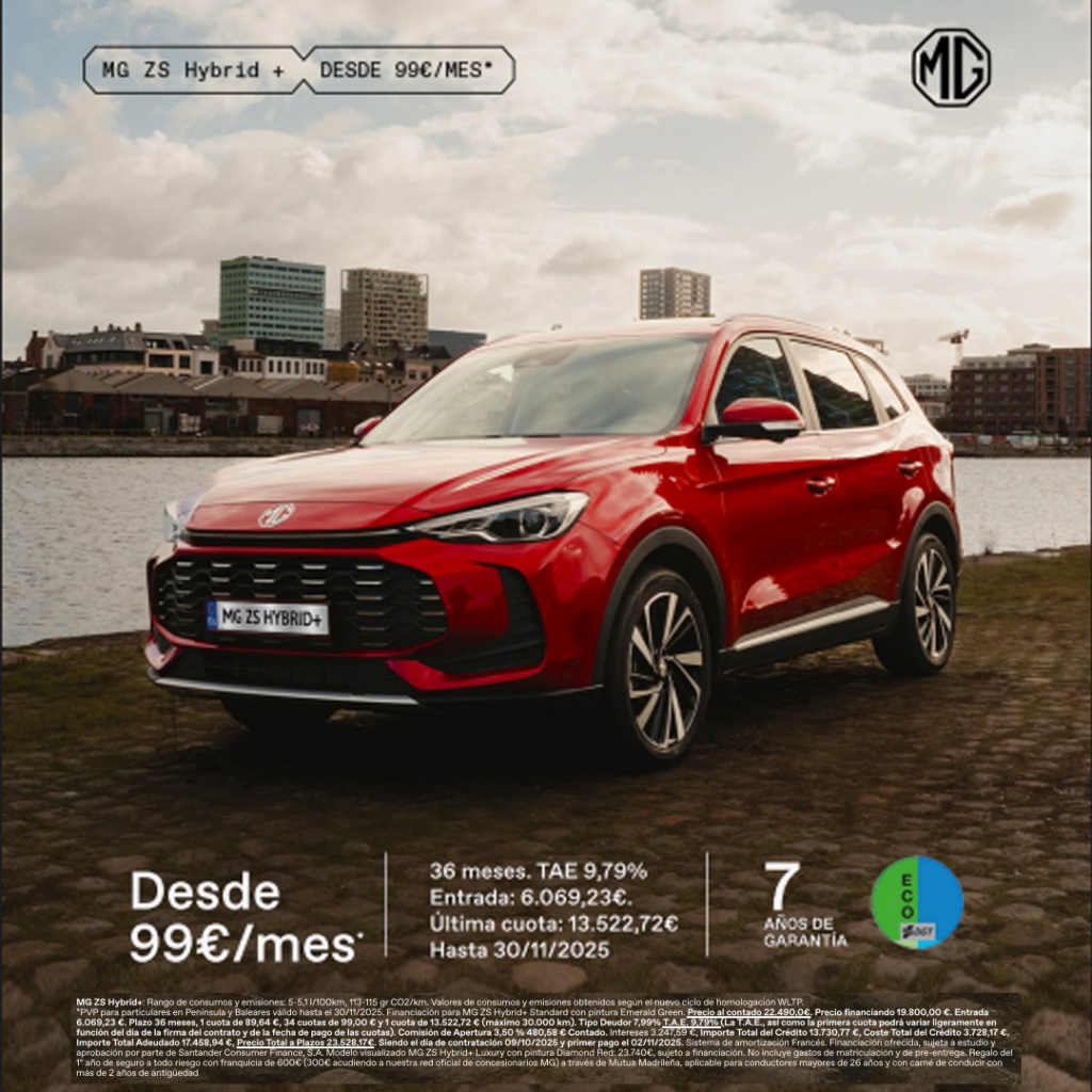 *PVP para particulares en Península y Baleares válido hasta el 31/12/2025. Financiación para MG ZS Hybrid+ Standard con pintura Emerald Green. Precio al contado 22.490,0€. Precio financiando 19.800,00 €. Entrada 6.069,23 €. Plazo 36 meses, 1 cuota de 89,64 €, 34 cuotas de 99,00 € y 1 cuota de 13.522,72 € (máximo 30.000 km).Tipo Deudor 7,99% T.A.E. 9,79%(La T.A.E., así como la primera cuota podrá variar ligeramente en función del día de la firma del contrato y de la fecha de pago de las cuotas). Comisión de Apertura 3,50 % 480,58 € Contado. Intereses 3.247,59 €, Importe Total del Crédito 13.730,77 €, Coste Total del Crédito 3.728,17 €, Importe Total Adeudado 17.458,94 €,Precio Total a Plazos 23.528,17€. Siendo el día de contratación 09/10/2025 y primer pago el 02/11/2025. Sistema de amortización Francés. Financiación ofrecida, sujeta a estudio y aprobación por parte de Santander Consumer Finance, S.A. Modelo visualizado MG ZS Hybrid+ Luxury con pintura Diamond Red: 23.740€, sujeto a financiación. No incluye gastos de matriculación y de pre-entrega. Regalo del 1º año de seguro a todo riesgo con franquicia de 600€ (300€ acudiendo a nuestra red oficial de concesionarios MG) a través de Mutua Madrileña, aplicable para conductores mayores de 26 años y con carné de conducir con más de 2 años de antigüedad