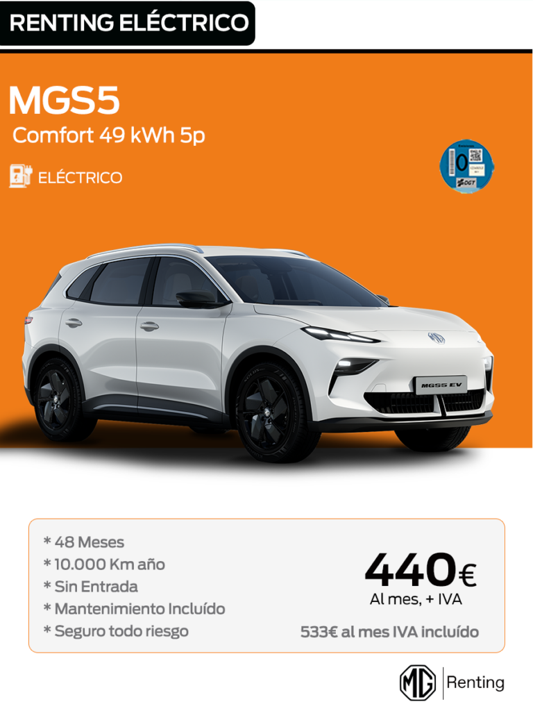 Modelo visualizado MG ZS ICE 1.5 Comfort con pintura Diamont Red: 20.090€, sujeto a financiación. No incluye gastos de matriculación y de pre-entrega. Desde 347 € / mes, IVA no incluido; 420 € / mes, IVA incluido. Oferta de arrendamiento calculada para 48 meses y 40.000 km totales (10.000 km / año). Oferta válida para Península y Baleares hasta el 30 de abril de 2026 o fin de existencias por el fabricante. La fotografía puede no coincidir con las versiones y/o equipamientos ofertados. Esta oferta está sujeta a la validación de riesgos y a la previa autorización de Arval Service Lease S.A.U. Para otros plazos, kilometrajes y para más información puede consultar en mgmotor.es y con su concesionario MG